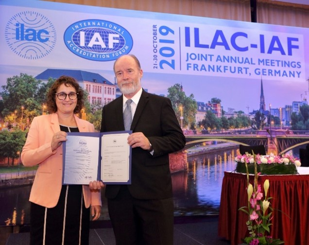 Kuvassa ILACin puheenjohtaja Etty Feller luovuttaa FINASin päivitetyn monenkeskisen tunnustamissopimuksen minulle FINASiin vietäväksi.