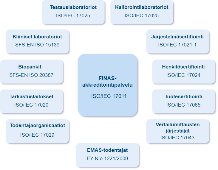 Testaus-, tarkastus-, sertifiointi-, kalibrointi- ja biopankkitoimintaa harjoittavat organisaatiot, vertailumittausten järjestäjät, todentajaorganisaatiot sekä EMAS-todentajat voivat hakea akkreditointia FINAS-akkreditointipalvelulta. Pätevyyden arvioinnissa noudatetaan päätöksessä FINAS P1 (pdf) vahvistettuja akkreditointivaatimuksia.